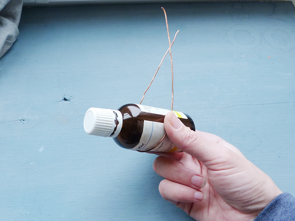 Take 15 cm of 16-g wire and make the 2 circles around any cylinder (the diameter about 35 mm).